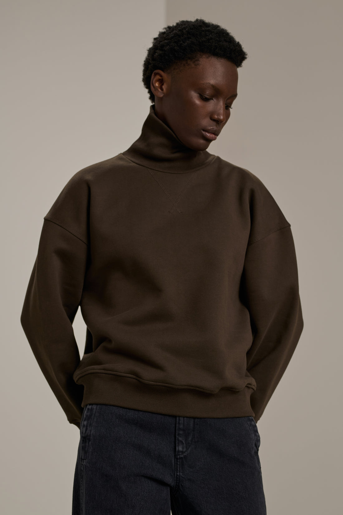 VITO is a high-neck sweatshirt in marled fleece. Its straight and loose fit envelops your figure with softness and freedom. It's the perfect blend of comfort and style, making it a must-have in your wardrobe.